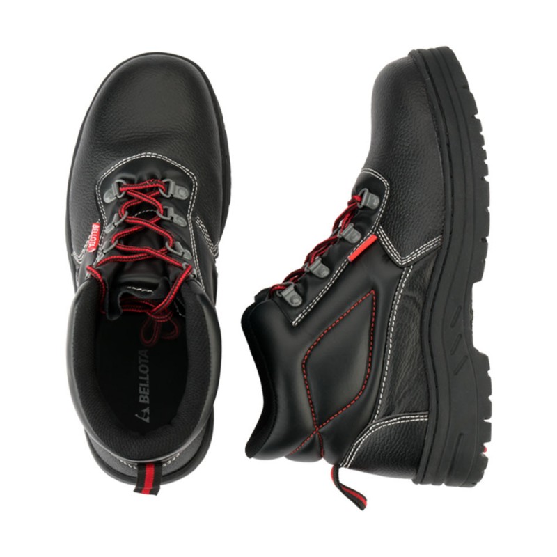 Bota: pele pigmentada; Sola: PU; Palmilha anti-perfuração: metálica; Biqueira de segurança: metálica; Forma extra larga, palmilha extraível moldada, rebordo acolchoado, pala em fole; Norma: CE - EN ISO 20345;
